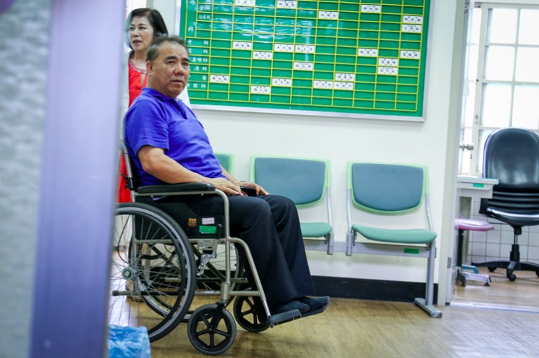宣布會議休息後,王定宇在場邊包紮療傷。