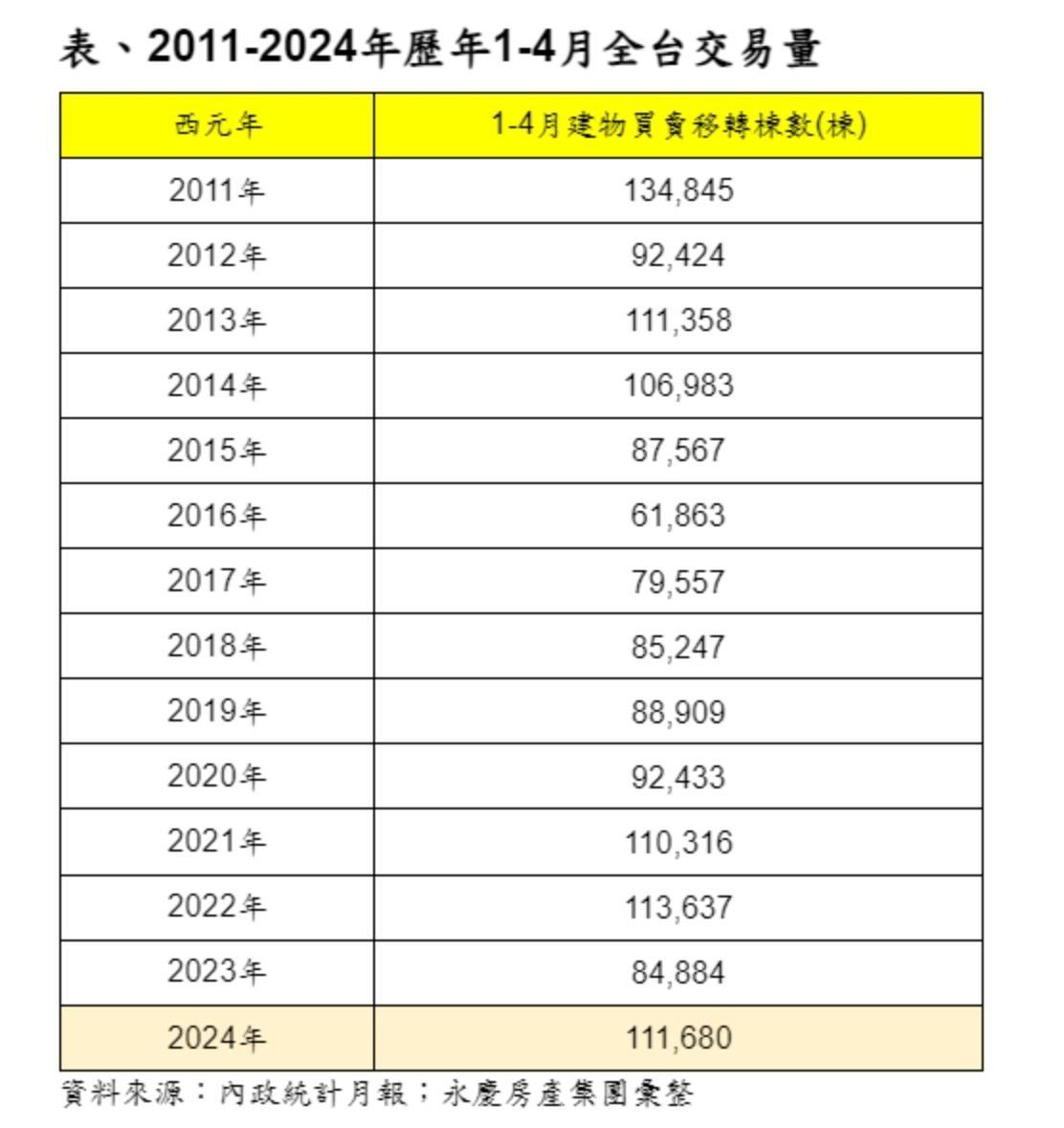 陳金萍說明,若合計今年前四月全台建物買賣移轉棟數,全台1-4交易量為111,680棟,與去年同期年增31.6%,是自2012年來次高紀錄,僅低於2022年的113,637棟,今年房市交易熱絡程度可見一斑。陳金萍補充,國內經濟穩定成長、出口暢旺、台股續創高以及消費者信心轉強等正向訊息釋出,讓民眾樂觀看待經濟前景,加上通膨預期,讓置產族群積極進場,而新青安優惠貸款也加速自住買盤加快購屋腳步,讓今年1-4月房市交易熱度再升溫,旺季仍旺。
