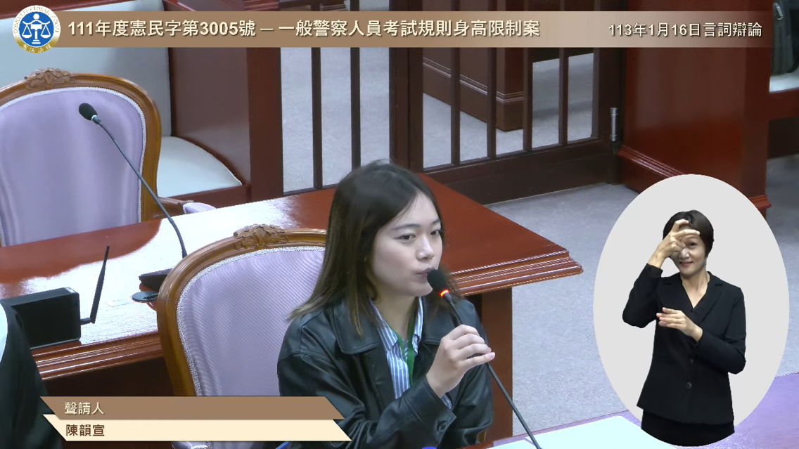今年1月憲法法庭進行言詞辯論時,陳韻宣說,他把消防警察當成一生的志向,也已經到高雄鳥松分局擔任救護消防,「不管是救護案件或是其他協助上,學長們或其他同事,並未對我的身高提出疑慮,或質疑不勝任這份工作,反倒是非常支持我去報考。」