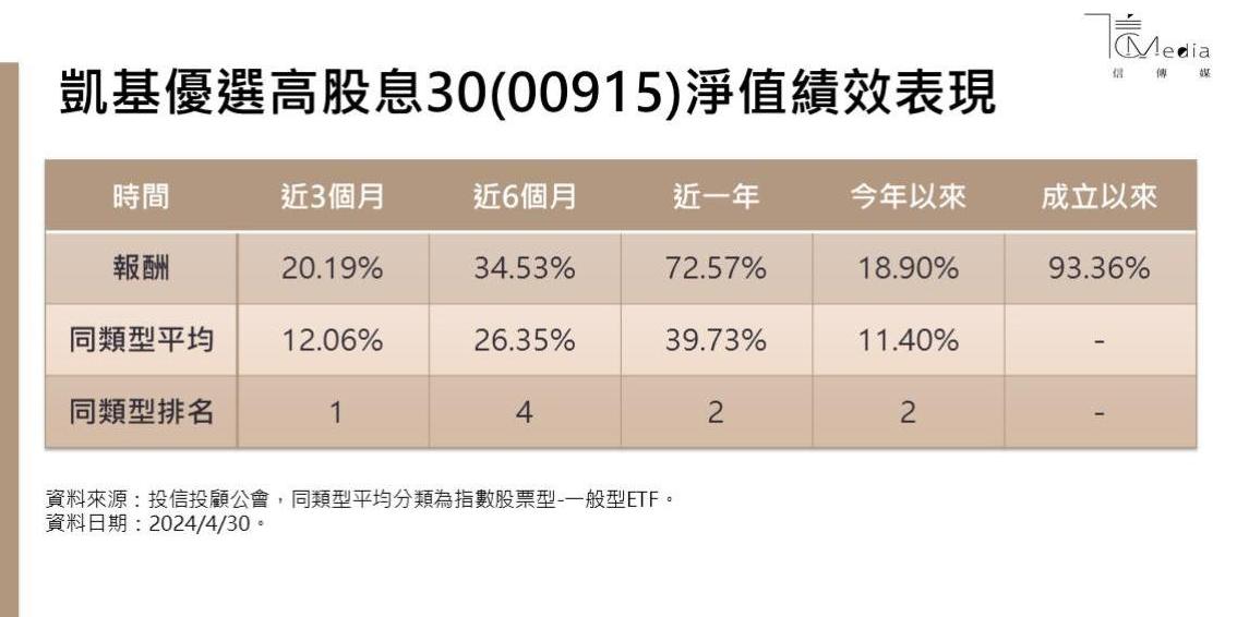 本次6月配息為凱基優選高股息30(00915)掛牌上市以來的第六次配息,預計每單位配發0.58元,總計00915成立以來配息金額累積來到2. 99元。00915不僅累積配息金額持續增長,價格動能也相當突出,根據投信投顧公會統計至4月底的資料顯示,00915今年以來淨值報酬上漲18.9%,近三個月淨值上漲20.19%,近六個月淨值成長34.53%,近一年淨值報酬率72.57%,成立以來淨值報酬甚至高達93.36%,00915今年以來、近三個月、六個月、一年的淨值績效表現,在所有指數股票型-一般型ETF當中,排名都落在前4名,報酬率優於同業平均(表)。