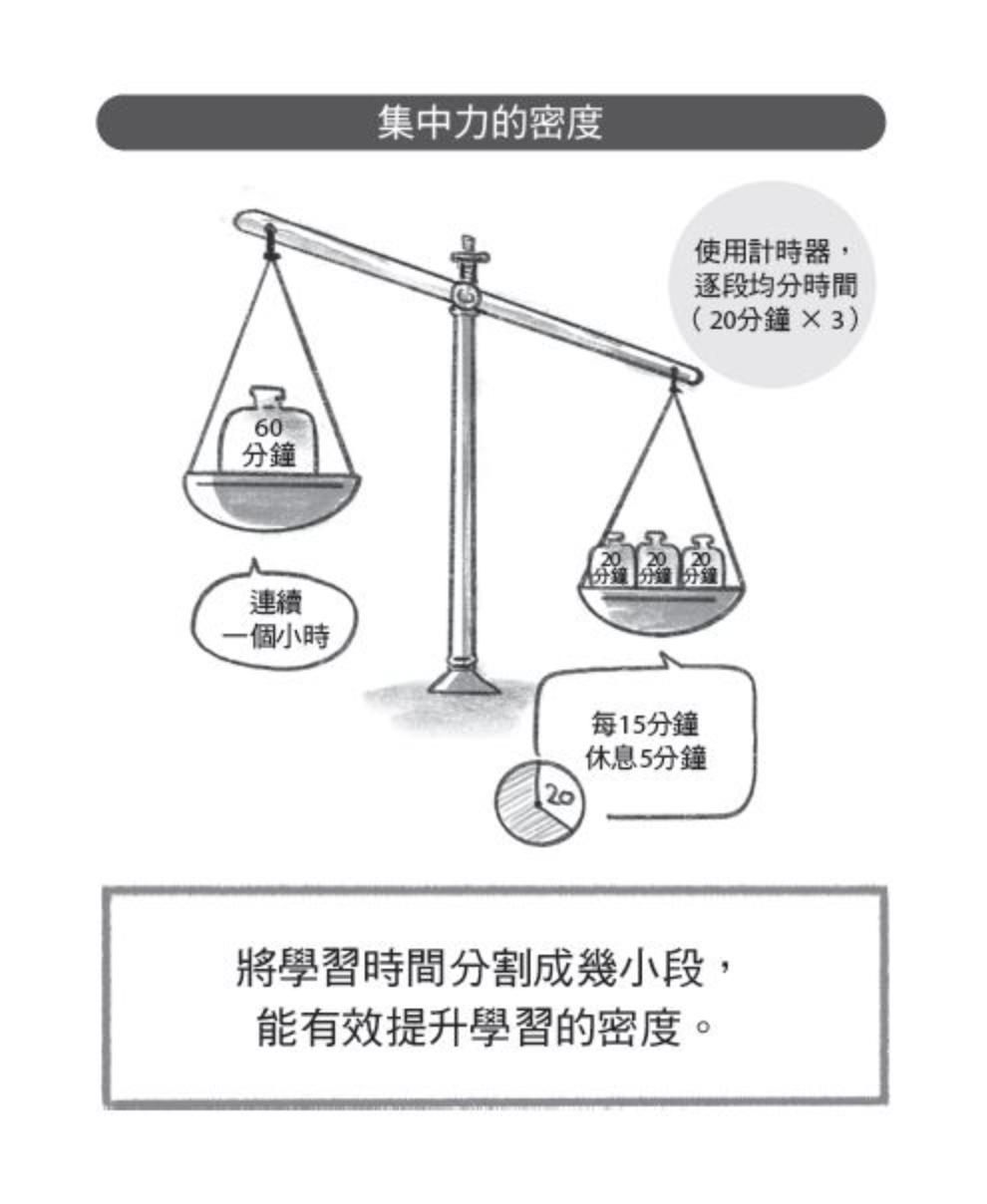 運用計時器,還可以分配單次的學習時間。受於天生的限制影響,人的集中力有限,通常很難長期持續下去。因此將學習時間分割成幾小段,可以幫助維持一定的集中力。舉例來說,如果計畫要學習一個小時,可以將其分成三段,每段二十分鐘,並在每段學習之間穿插五分鐘的休息時間。這樣比起連續學習一個小時,更能增加集中力的密度。