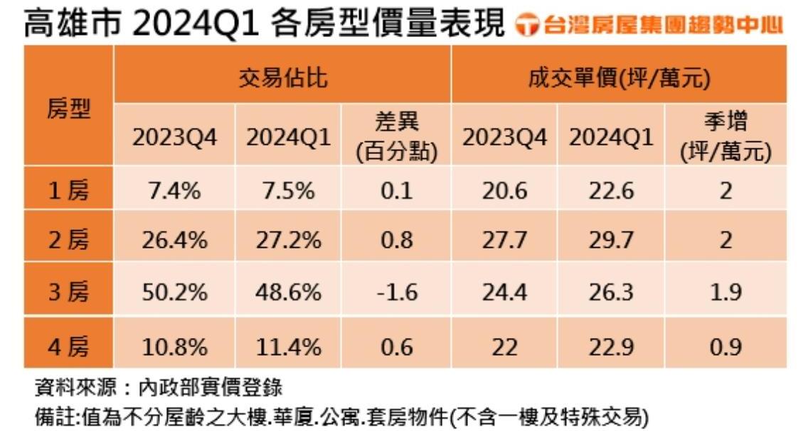 高雄買氣旺盛,又以哪種房型最受歡迎?根據統計,高雄Q1仍以2~3房為主力,不過3房買氣相比上一季縮水了1.6個百分點,反而1~2房及4房買氣微增,其中又以2房買氣增加較明顯,季增0.8個百分點,而Q1各類房型房價均呈上揚,其中1~2房小宅,每坪單價季增2萬元,價漲同樣最明顯。