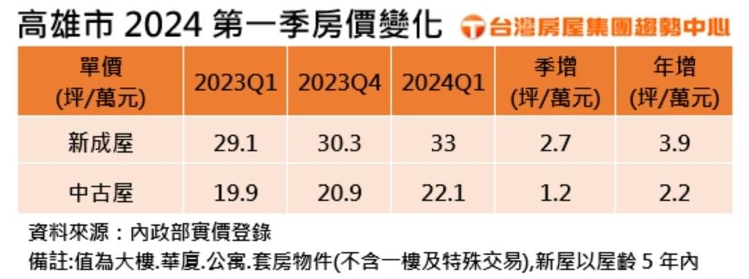 高雄5月買賣移轉棟數首度衝破5千棟,刷破歷史新高,買氣爆熱,近期房價也衝高高!台灣房屋集團根據內政部實價資料統計,高雄今年第一季房價表現,屋齡5年以上的中古大樓,今年Q1平均成交單價來到22.1萬元,相比上一季,才隔三個月時間,每坪均價已增加了1.2萬元;而Q1新成屋平均成交單價更來到33萬元,同樣時隔一季,每坪單價就飆增了2.7萬元,季漲近一成,年增價差更達3.9萬元,如以30坪新屋試算,購屋族晚三個月買房,恐得多準備近百萬元購屋預算。