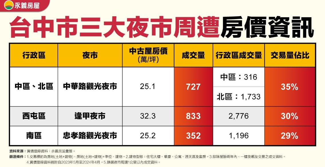 中華路觀光夜市橫跨中區、北區,過去一年的房市交易量達727件,中區及北區有超過35%的交易量來自於此。永義房屋台中一中三民加盟店東郭誌蘭表示,中華路夜市歷史超過40年以上,從夜市的一公里範圍來看,周圍有百貨公司、醫院、公園等各種優質條件,又鄰近台中火車站交通便利,不過周圍物件屋齡九成超過30年,讓每坪房價僅25萬左右,房價相對親民,也帶動需求量上升。