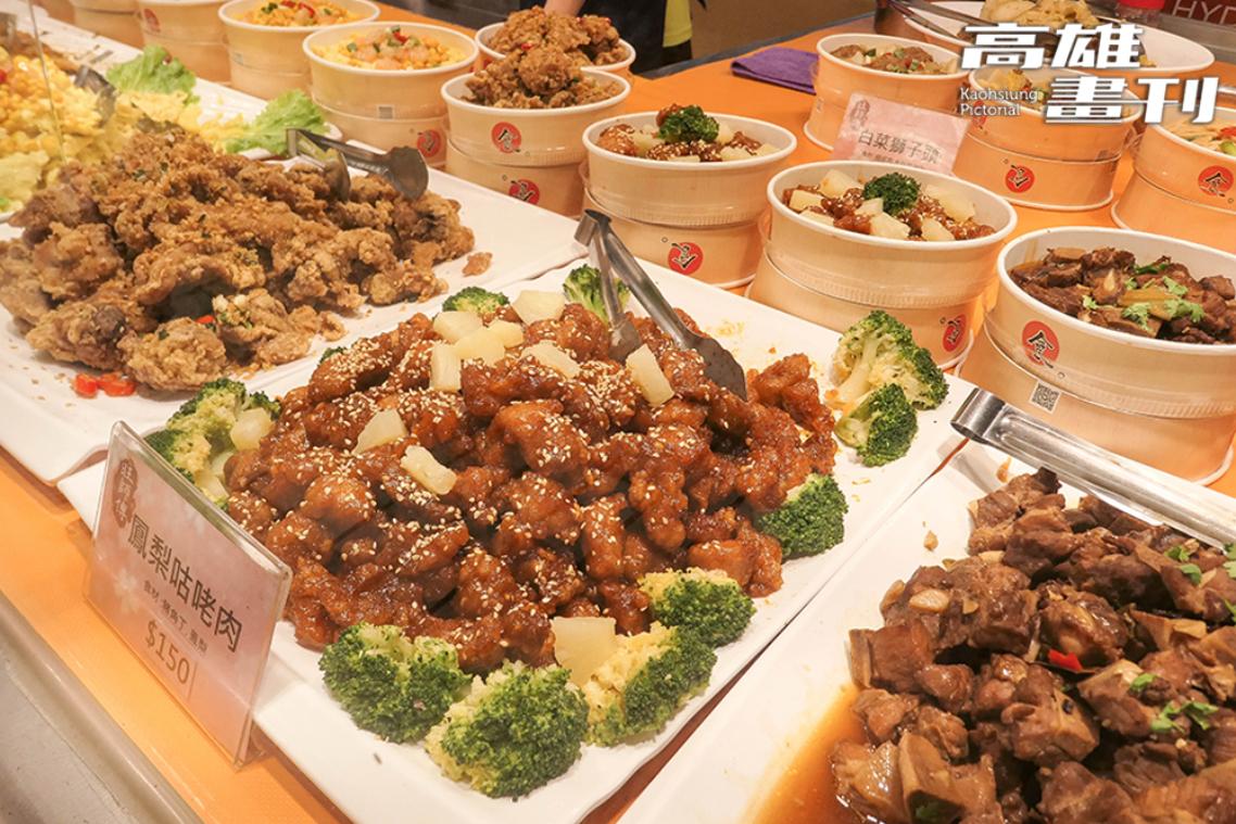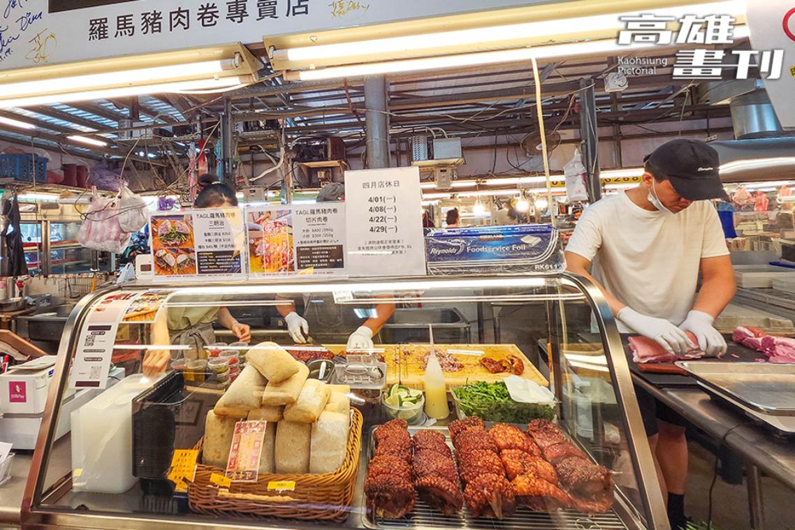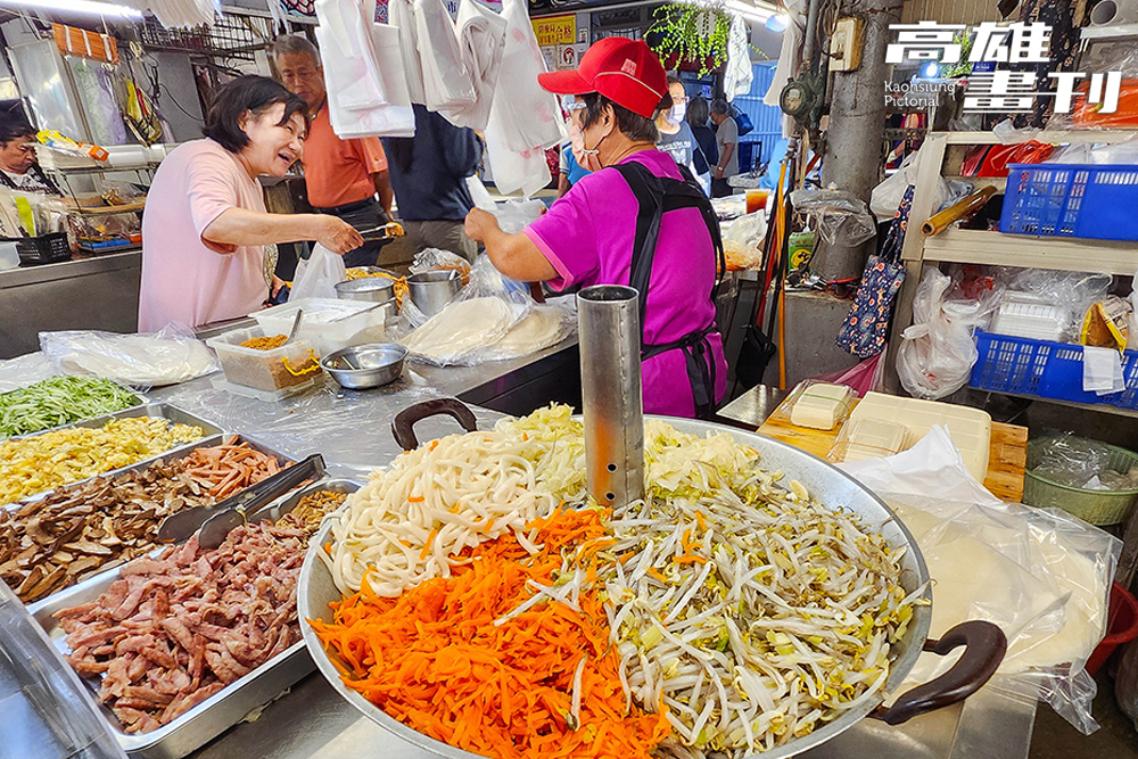 晚餐時刻,自由黃昏市場的熟食攤不容錯過,王巧溱說:「市場內有許多排隊名店,晚餐要是懶得煮,也可以在這裡解決。」熟食攤種類五花八門,從傳統的手工油飯、碗粿、蔬菜炸,到年輕老闆創業的厚煎玉子燒、網路人氣六角爆乳包、羅馬豬肉捲等,儼然是小型的美食聯合國,而香氣四溢的沙威瑪、加入近10種配料的潤餅捲,還有開業一甲子的現炒肉鬆等,每個攤位都是大排長龍,太晚來可能就吃不到了。