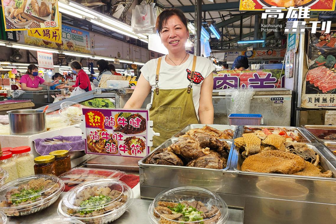 黃昏市場另一主力客群為上班族,許多攤販為此會幫顧客先搭配好食材,像是海瓜子與九層塔配套賣,買回家就能馬上料理。「逛傳統市場的好處,就是食材新鮮選擇多樣,充滿變化,一些季節性蔬菜,像是可以炒臘肉的蒜苔、西瓜綿等,通常賣幾天就沒了。」王巧溱指出超市的品項較固定,一些當令食材只能在市場看到,還有許多熟食攤老闆的私房菜色,也是可遇不可求。「像是這家阿桂師,我常跟老闆買麻辣鴨血和熟肉,回去排一下就是一道菜。」她指著滷牛肉、粉肝等熟食料理的攤位,老闆娘還製作了滷牛腱、肚、筋三寶拼盤,小酌宴客都合適。