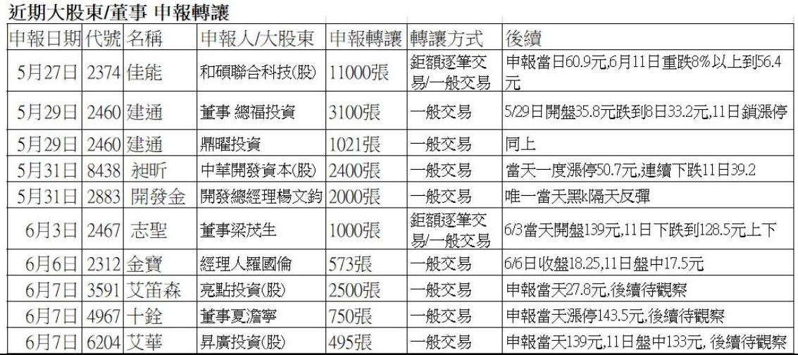 十銓則被董事夏澹寧申報轉讓750張,申報當天十銓的股價收在漲停板143.5元,11日早盤一度漲到152元,11點後收斂到146元上下盤整,而艾華則有大股東昇廣投資(股)申報轉讓450張,申報當天139元,變現約6千多萬元,但11日盤中下跌到133元,跌了4%,以之前大股東、董事大賣股票後,股價跌多漲少來看,這些股票後續仍有待觀察。