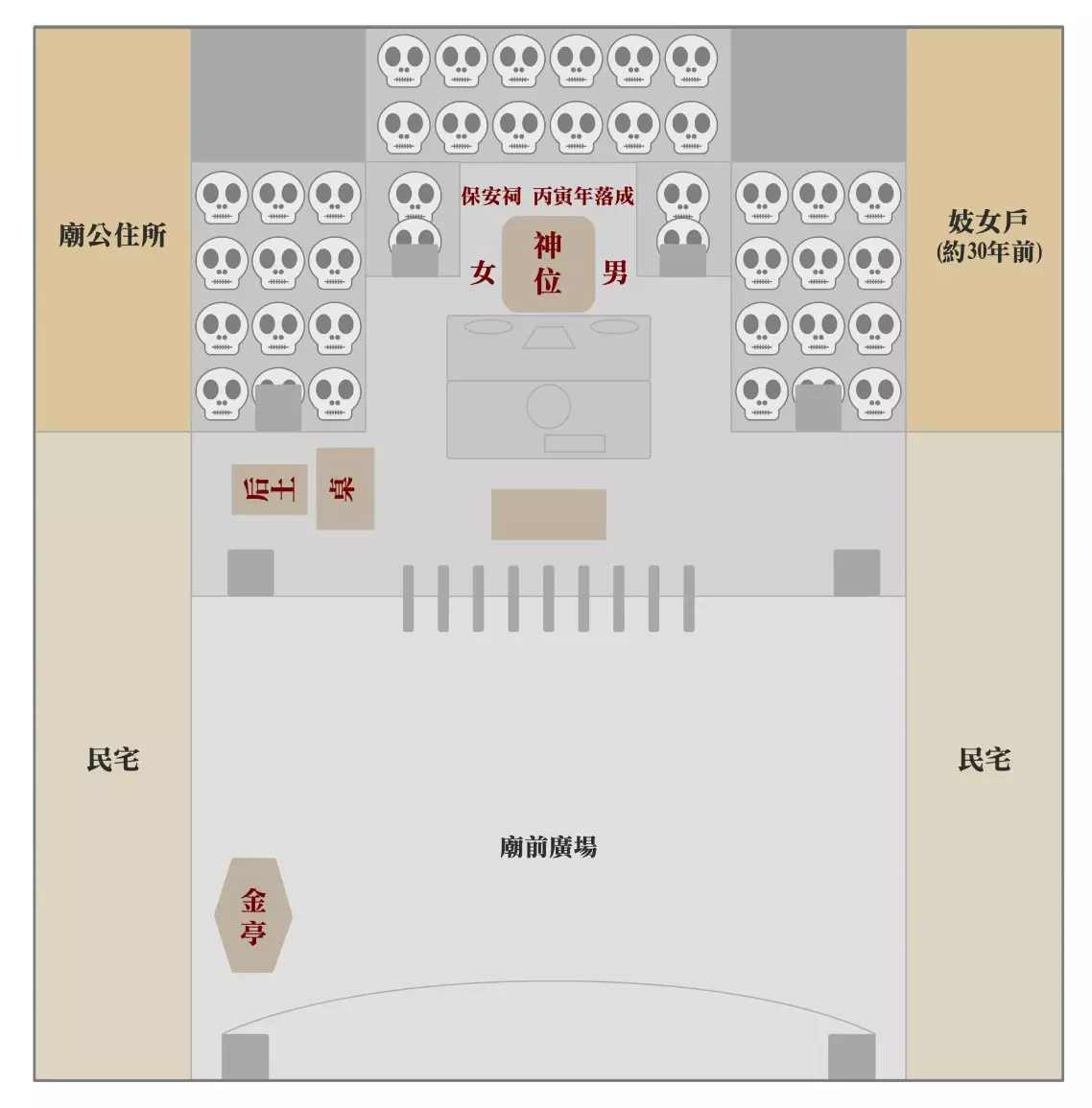 1924 年,為了興建東勢公會堂等公有設施,籌劃將該處新舊發掘的骨骸遷往一公里外的東勢本街萬善祠(百姓公廟)。1926 年,百姓公廟擴建完成更名為保安祠,一直存續至 921 地震前。