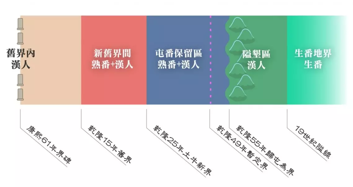 三層制的最外層沿海平原是從大陸來臺開墾的漢人,內陸山區則是當時被稱為「生番」的高山原住民族。兩者之間沿山地帶,夾著漢化較深、官府控制程度較高的平埔族「熟番」。為了因應邊界(隘口)防守人力不足的問題,官府遂動員熟番負責守隘、護衛軍工匠等任務。