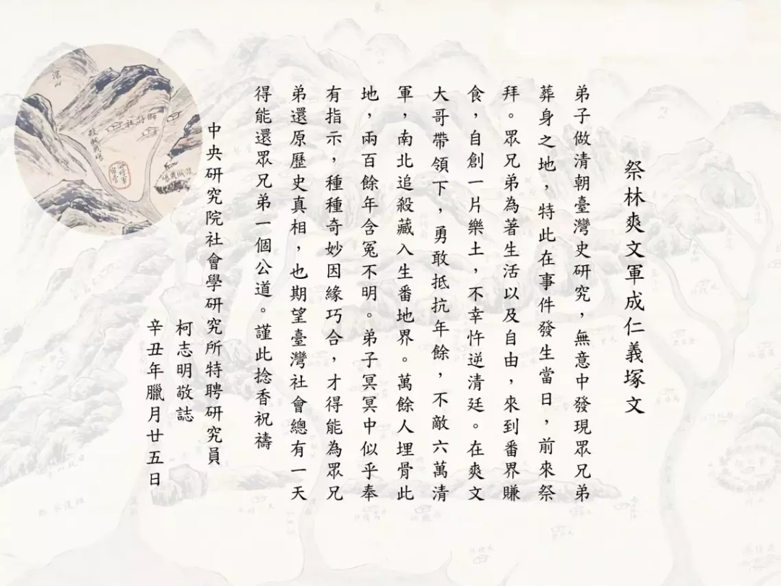 在完成巨作《熟番與奸民:清代臺灣的治理部署與抗爭政治》後,柯志明獻書還願並特別寫了一篇祭文,在骨骸長眠之地恭敬朗讀,既告慰死者在天之靈、也感謝冥冥中的因緣巧合,讓他得以還原歷史真相。然而,即便歷史真相已明,我們又能否真正記取歷史教訓?