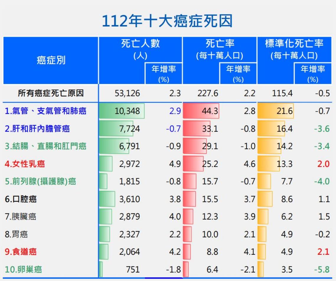 十大癌症死亡率依序為(1)氣管、支氣管和肺癌(2)肝和肝內膽管癌(3)結腸、直腸和肛門癌(4)女性乳癌(5)前列腺(攝護腺)癌(6)口腔癌(7)胰臟癌(8)胃癌(9)食道癌(10)卵巢癌。十大癌症死因順位同111年。