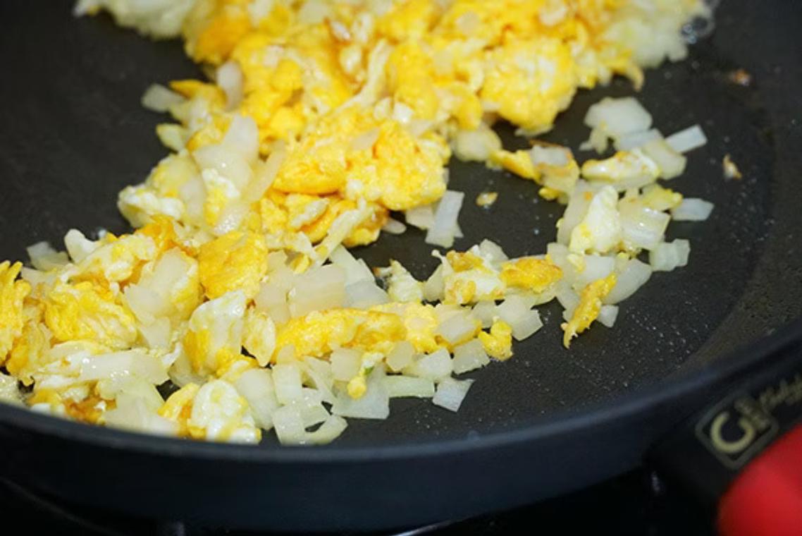 加熱充分熱鍋,全程使用中大火。先加入雞蛋爆香。過程充分攪拌,炒出蛋香。