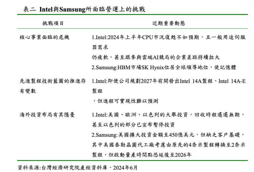 根據表二的匯整資料可知,Intel及Samsung則各有其核心業務、投資面的挑戰,也就是雖然Intel已獲得美國晶片法案補貼85億美元,且亦有來自於美方政府賦予其肩負美國重返半導體製造榮耀的重責大任,但Intel要回歸晶片製造領導地位的道路依然艱難;另外短期內Intel及Samsung要彎道超車台積電仍有極大實際面的困難度。事實上,Intel與Samsung所面臨營運上的困境包括核心事業面臨危機、先進製程技術藍圖的推進存有變數、海外投資布局有其隱憂等。