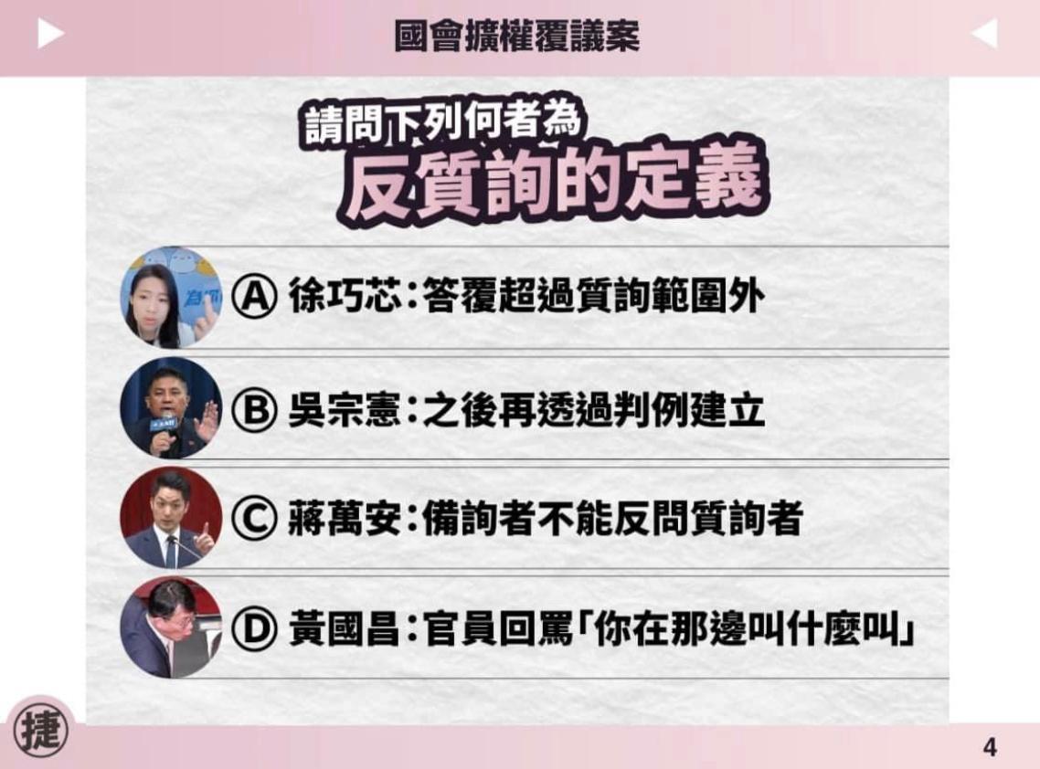 針對「反質詢」定義,民進黨立委黃捷秀出圖卡,指國民黨立委徐巧芯曾對此定義為「答覆超過質詢外」,民眾黨立委黃國昌則定義為「官員回罵」,國民黨台北市長蔣萬安說「備詢者不能反問質詢者」,國民黨立委吳宗憲則推給司法機關稱「之後再透過判例建立定義」。黃捷因此質疑,到底什麼是「反質詢」的定義?