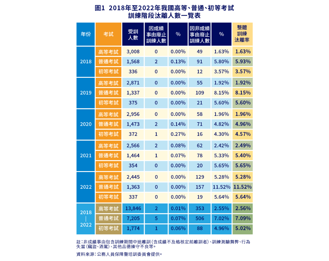 若單從因成績事由廢止訓練者的比例來看,會發現篩選的效果並不太好;然而,實務上亦不乏存在「受訓學員已自知無法通過訓練,在成績被核定不及格前即自行離訓」等情況,因此最後會被歸類為因非成績事由廢止訓練的結果。然而,前述情形所占的比例究竟有多大,因資料本身的侷限,無法進一步得知;因此,「整體訓練之汰離率」應可被視為我國公務人員訓練階段淘汰效果的最積極數據。
