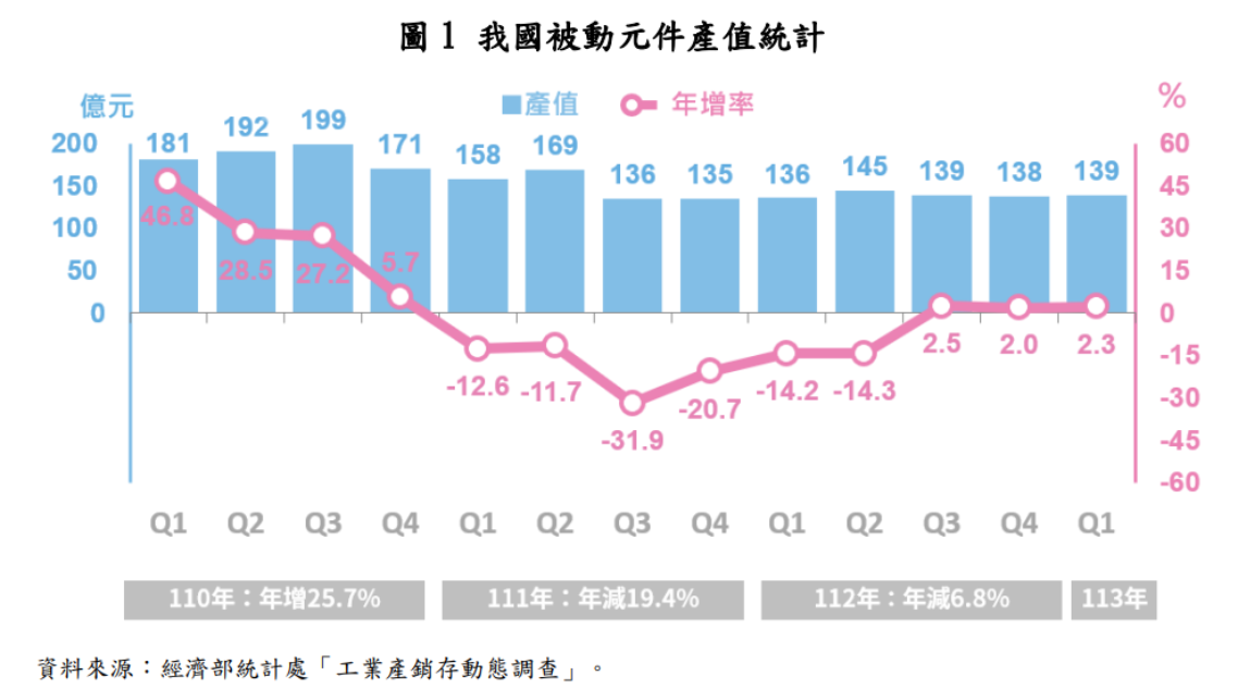 經濟部表示,111年起俄烏戰爭爆發,全球通膨升息壓力攀升,終端市場需求疲弱,再加上產業進行庫存調整,我國被動元件業產值從110年的高峰、約25.5億美元下滑,111年及112 年分別年減19.4%、6.8%,連續2年負成長。