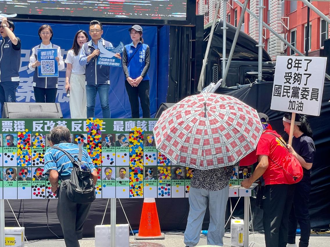 有趣的是,活動現場也出現票選「最應該罷免的民進黨立委」看板,現場民眾興奮地拿著各種顏色的小貼紙,貼在自己最想罷免的民進黨立委格子內,許多特定立委已經被貼到連名字和照片都看不見,民進黨立委吳思瑤、鍾佳濱、黃捷、王定宇等人都被貼滿。