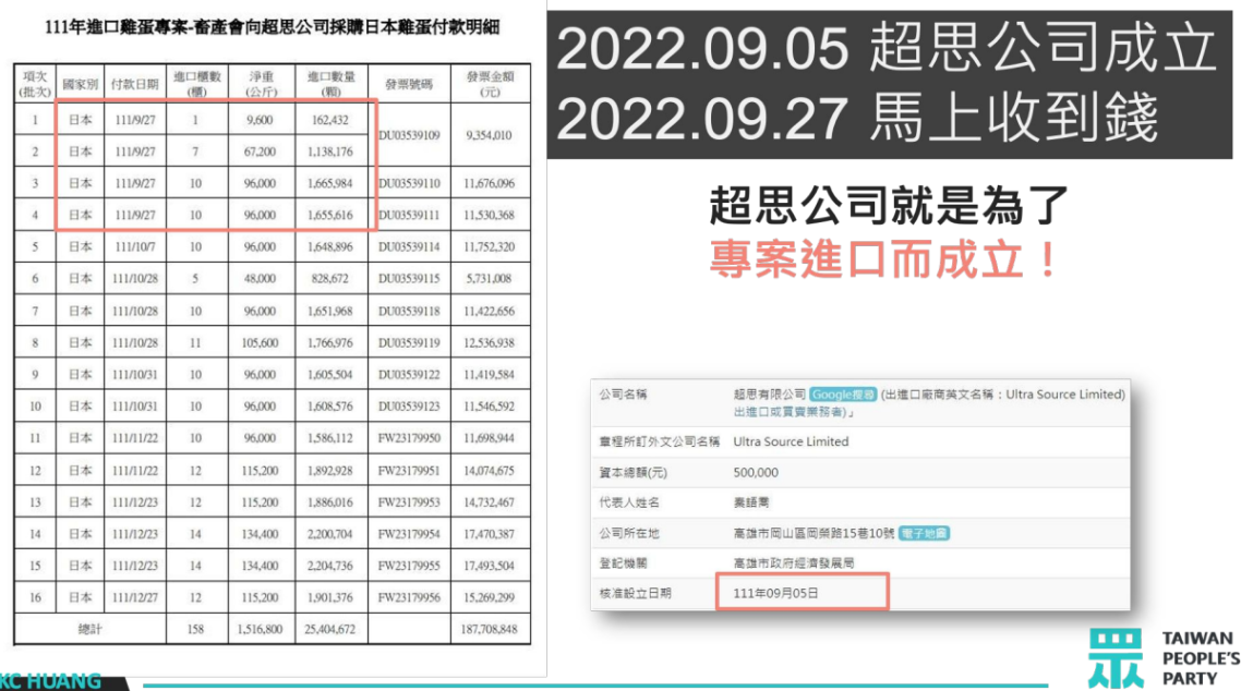 如此指控勢必不能毫無根據,黃國昌秀出畜產會向超思採購日本雞蛋的付款明細並表示,第一批付款為9月27號,9月初成立之公司,月底就接受中央畜產會的付款,代表在接洽從日本進口雞蛋一事上,早就「喬好」由當時尚未存在的公司-超思來負責,如此才有可能有剛成立、就入帳的情形。