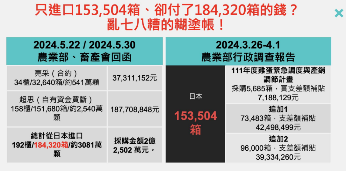 依照農業部提供之畜產會匯款明細,自行加總後,超思進口158櫃、2540萬顆日本雞蛋,發票金額為1.87億元。但農業部回函之兩個公文,箱數卻兜不起來,在被發現箱數不對之後,從18.4萬箱改為15.3萬箱,相差32櫃、3萬箱左右,約5百至6百萬顆雞蛋,黃國昌不解,中間落差怎麼回事?