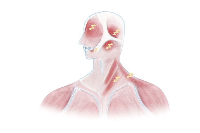 有些患者相咬的力道不僅傷到牙齒,更刺激到口腔以外部位。譬如,有患者咬到顳顎關節痛張不了口,或是牽動到顏面的三叉神經,導致齒顎部位不明疼痛。甚至有患者咬力強到影響頸椎,導致常態性的偏頭痛、肩頸僵硬痠痛、耳鳴失眠等後遺症。