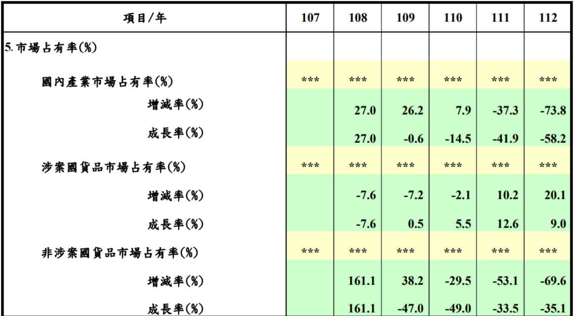 再加上從109年至112年,國產品內銷量也逐年下滑,即便在我國需求量於111、112年皆增加,國產品內銷量卻反而更為減少,年減幅度分別超過3成與5成,致使國產品的市場占有率自108至112年逐年下降;同期間,涉案貨物在進口市場之占有率皆高達99.5%以上,也就是說,事實上不僅幾乎獨占我國進口市場,同時亦搶占國產品之市場。