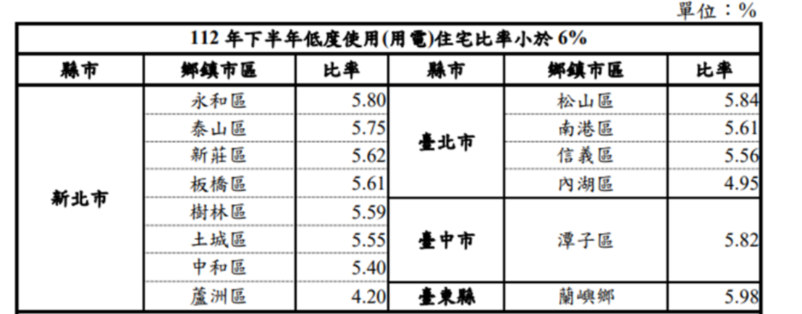 根據內政部低度用電統計,去年下半年全台低度用電(空屋率)低於6%的區域,新北市就佔了8個區,至於台北市則都在東邊的區域,包括松山、南港、信義與內湖區,其他區域僅有台中市潭子區低於6%,顯示大台北地區的人口密度甚高,老房子也有居住使用價值,絕大多數的房屋都有人使用,空置狀況在全台來看偏低。