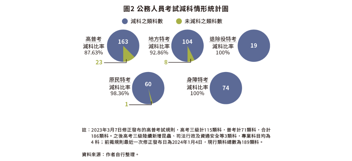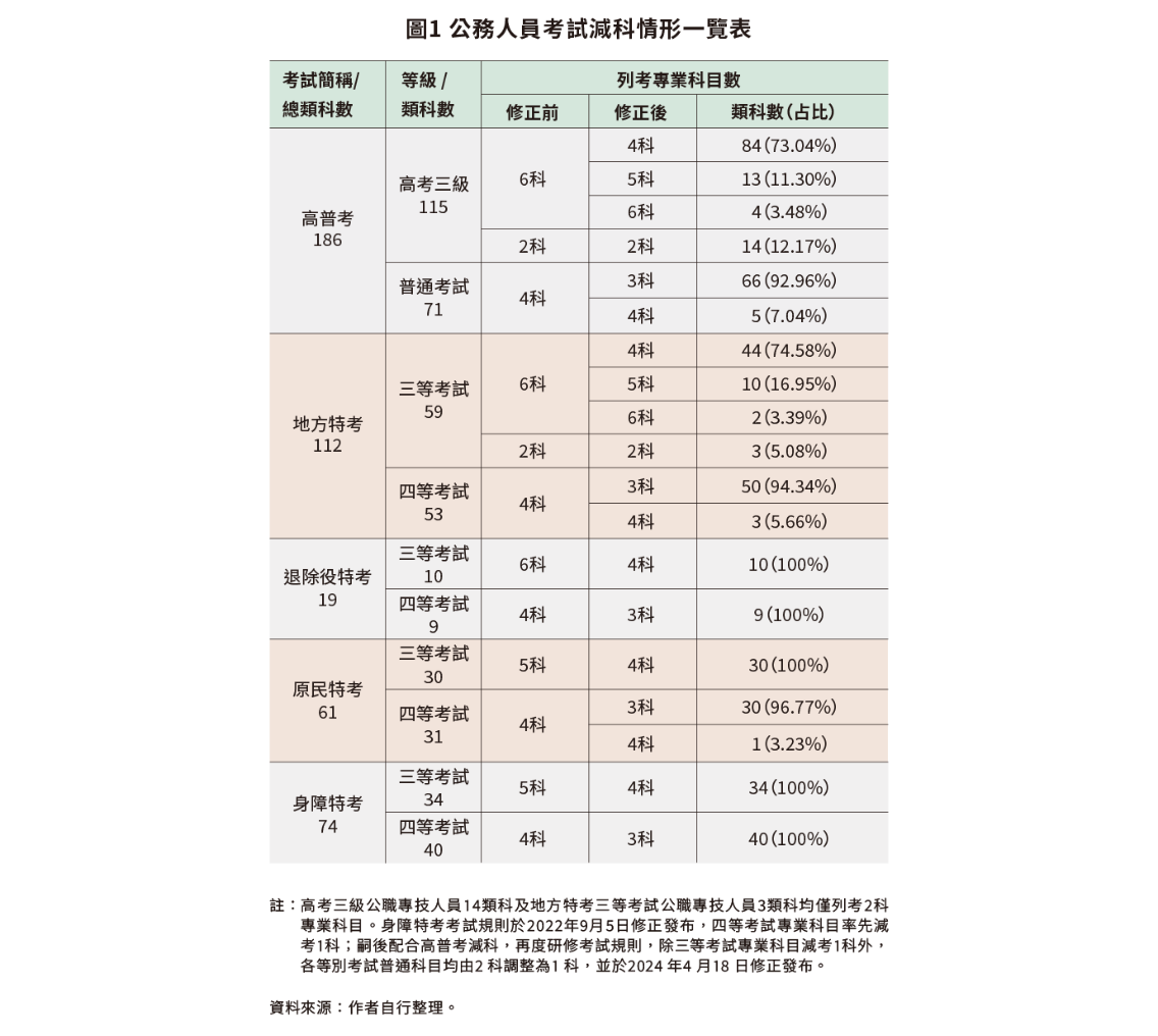 接續高普考的減科改革,地方特考、退除役特考、原民特考及身障特考,也參與了這場考科瘦身計畫,大幅減少列考科目數。