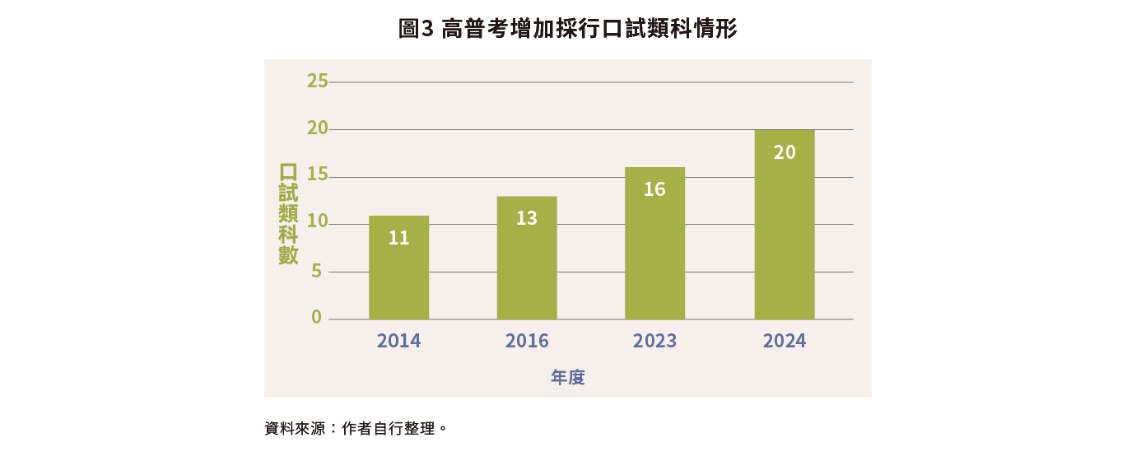 同時,考選部為發揮口試的功能,積極與涉外性較高類科的用人機關溝通,決定於高考三級僑務行政、國際文教行政類科增列第二試口試,並將高考三級客家事務行政類科口試的占分比重由10%提高至20%,使考試更貼合機關需求,並於2024年1月1日施行(如圖3)。