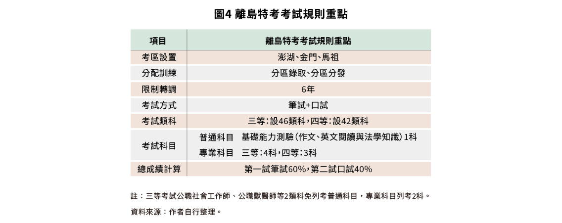 考試院於2023年12月21日訂定發布離島特考考試規則,2024年正式啟動(如圖4)。這項特種考試的設計,不僅呼應離島地區政府對於攬才和留才的需求,也讓有心投入離島建設發展的應考人,有更多機會一展所長。