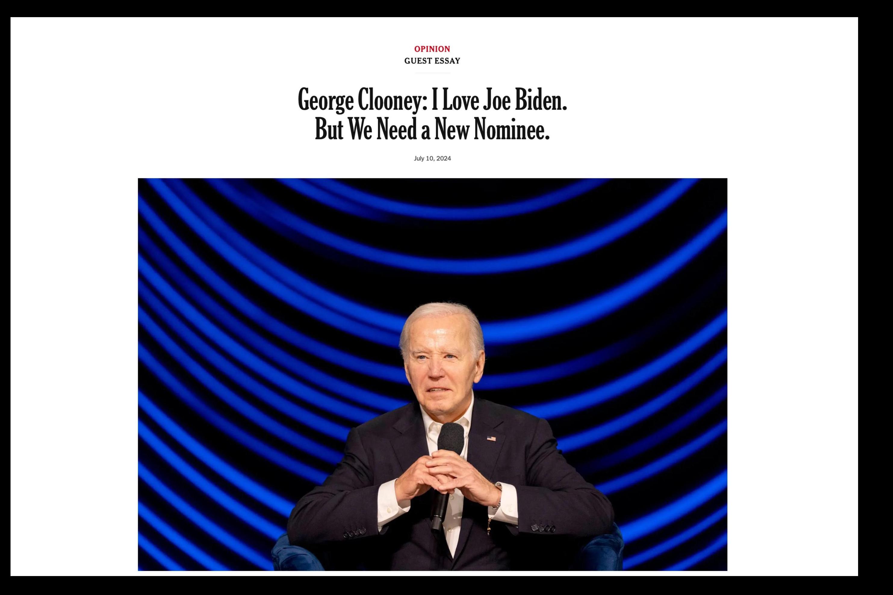 克隆尼在專欄《我愛拜登、但我們需要新候選人》中寫道:「我愛拜登,作為一位參議員、一位副總統、一位總統;我認為他是一位朋友,我相信他。」「說這話令人心碎,但三週前和我一起在在募款活動中的喬·拜登已經不是2010年那個『做大事拜登』了。」「他甚至不是2020年的喬·拜登,他是我們在辯論中看到的那個人。」