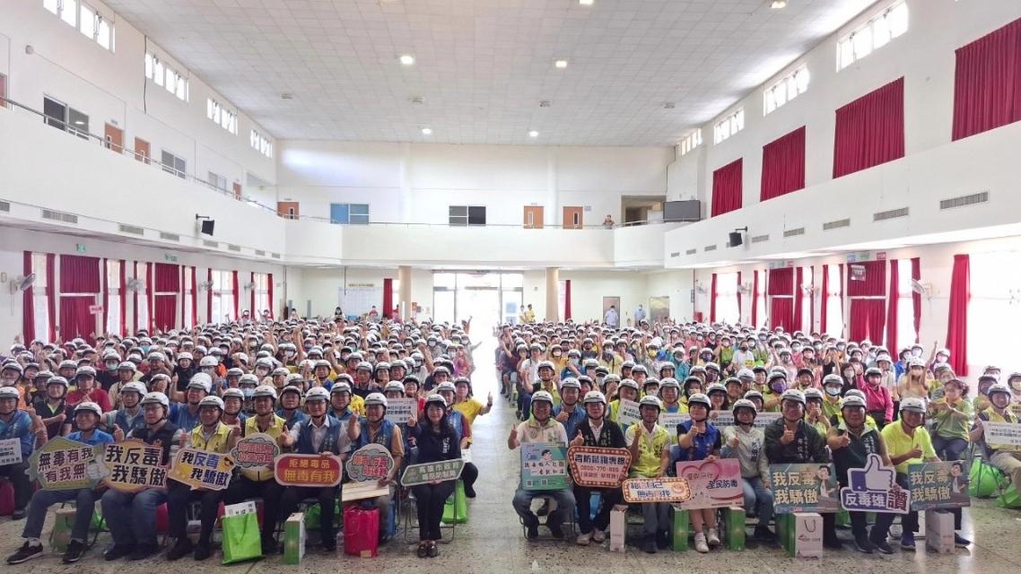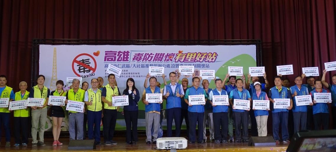 高雄市政府毒品防制局持續推動首創「里辦毒品防制關懷站」,今(11)日於仁武里里民活動中心成立仁武、大社兩區25里毒品防制關懷站啟動儀式,江瑞鴻議員、張勝富議員黃飛鳳議員、邱俊憲議員均親自出席,賴瑞隆立委及林岱樺立委代表、吳利成議員代表、市政顧問沈英章及黃明寮、仁武分局吳副分局長、仁武區大社區各級學校校長、仁武區調解委員會唐坤峰主席、戶政事務所邱金寶主任、婦參小組邱秋月副召集人及仁武區農會鄭椽晟總幹事等均到場支持,林瑩蓉局長頒發「里辦毒品防制關懷站」站牌予仁武、大社兩區25里里長,吳茂樹區長、王瑞麟區長、仁武區許有長里長主席及大社區林義萬里長主席率領25位里長、鄰長、志工隊、巡守隊等約800位里民熱情相挺,共同戴上毒防局特製反毒雄讚安全帽,齊力宣誓反毒。