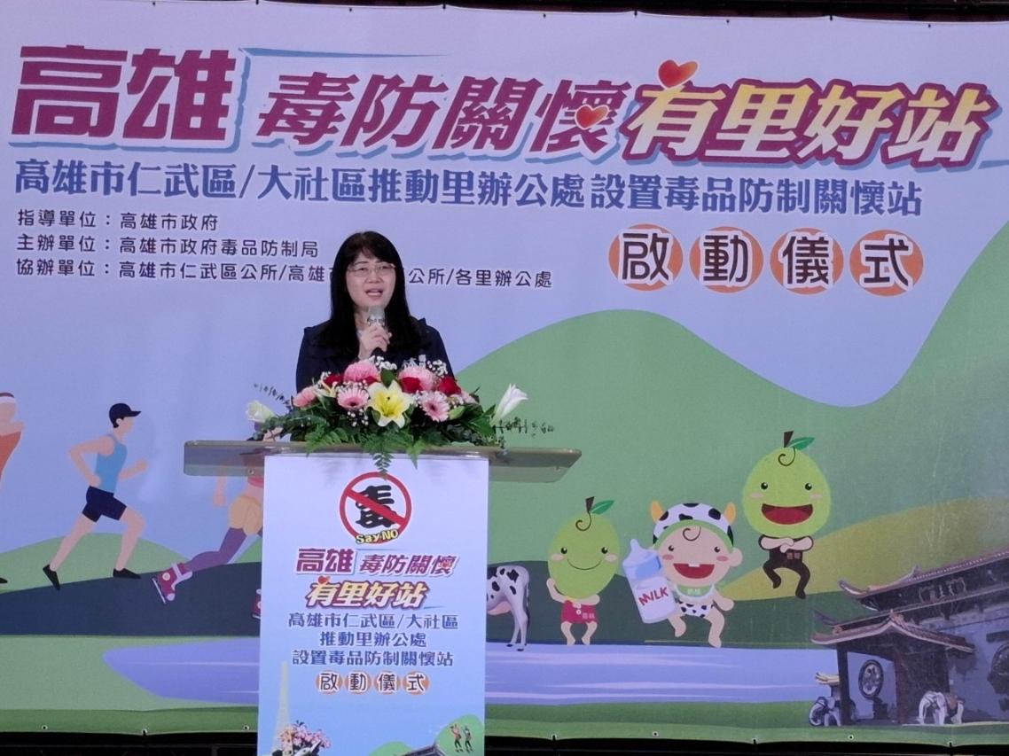 林瑩蓉局長致詞感謝立委、議員、里長主席、里長、鄰長、志工隊、巡守隊以及民政局、區公所的全力支持,並表示毒防局希望建構社區綿密毒防網,與各區里長合作,於里辦公處設置毒防關懷站,在社區第一線由毒防局提供毒防宣導、諮詢、轉介、關懷的一站式服務,今日仁武大社二區25里的加入,已達703站,毒防局突破700站的服務,高雄市政府獨步超前全國各縣市!