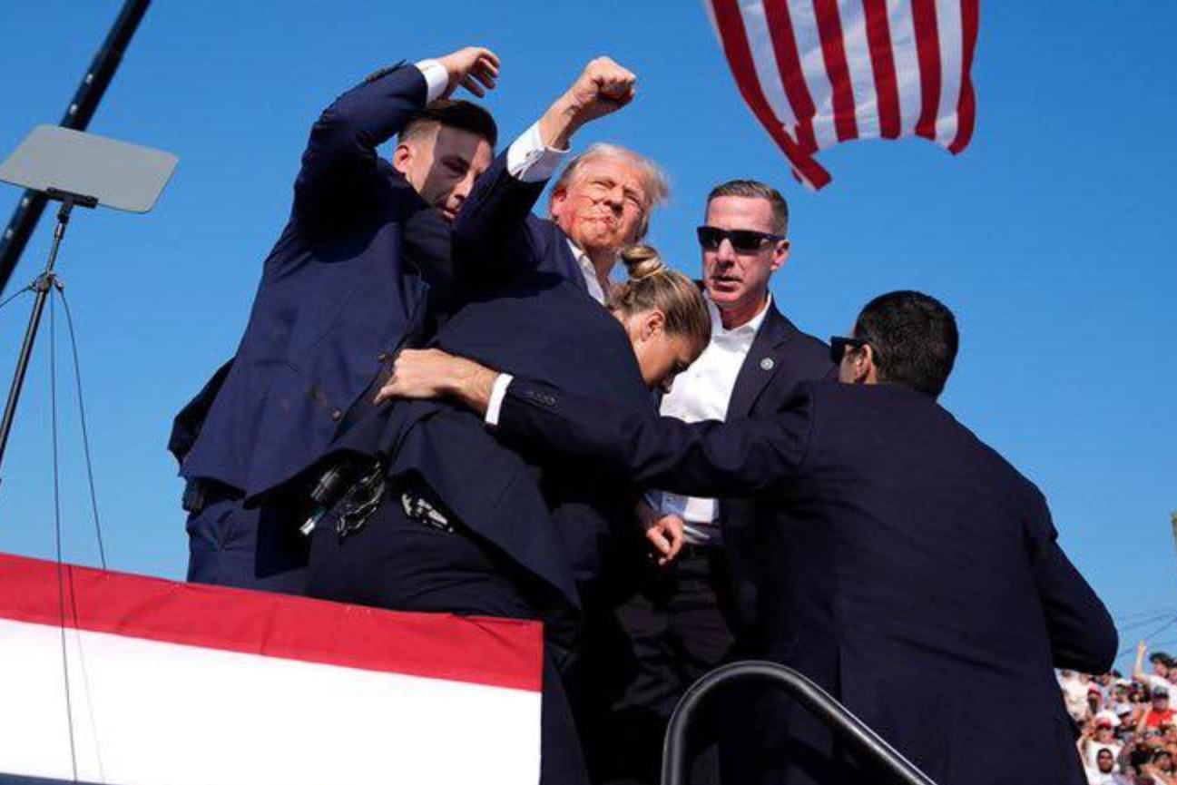 川普13日頭戴紅色競選棒球帽正發表演說,說到口頭禪「take a look what happened」現場突然傳出好幾聲槍響,伴隨人們的尖叫聲,川普摀著右耳蹲下,但此時又傳出好幾聲槍響,現場群眾一邊發現他中彈,一邊對這突然來的一串槍響嚇得驚叫連連,川普隨後被護送走,照片中他右邊耳朵、臉頰滲出血跡。