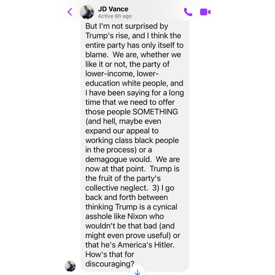 范斯也曾在同年年8月寫了一篇刊登於《紐約時報》的評論《為什麼川普的反戰信息在白人美國中引起共鳴》。他在內容中宣稱川普「不適合擔任我們國家的最高職位」,范斯的法學院室友麥勞林(Josh McLaurin)爆料范斯曾認為川普是個像前總統尼克森(Richard Nixon)一樣的混蛋,但不會那麼糟糕。但范斯也說川普是「美國希特勒」。