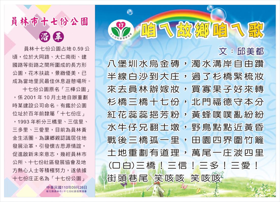 透過歌謠塑造十七份社區的意象,利用能傳唱的歌曲來詮釋十七份,帶給十七份帶來全新的意象與風貌,社區更將歌謠加以數位化,透過學校、社區活動中心等公共據點及發佈在社群網站快速傳播,讓大家都能琅琅上口來歌頌,與更多的人分享製作成果,並且讓更多人深入認識在地十七份社區的由來,也配合彰化縣文化局舉辦成果發表會。此外,十七份社區也成立社團詩歌班,結合說唱藝術的形式,在黃梅調悠揚的曲調下,搭配竹板快書的節奏,領著長輩緩緩唱出「咱ㄟ故鄉咱ㄟ歌」。