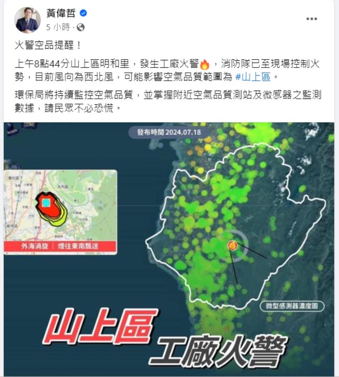對此,黃偉哲也在臉書發布火警空品提醒,表示空氣品質可能受影響的地區為山上區,他也表示環保局將持續監控空氣品質,並掌握附近空氣品質測站之間控數據,請民眾不必恐慌。