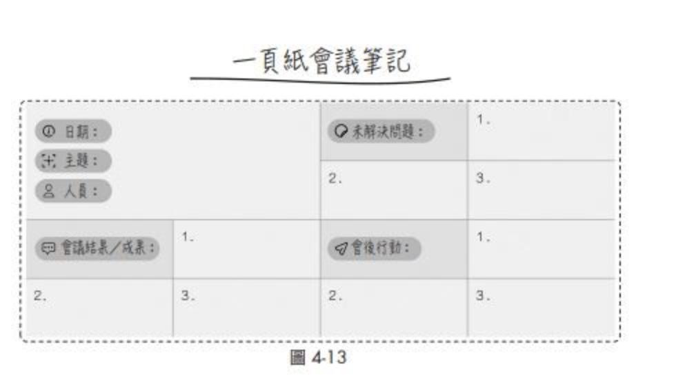 第二種,行動指南(一頁紙會議筆記)—借鑒日本豐田公司的一頁紙工作法,一目了然地整理會議的關鍵內容,記下對工作有助益的重點資訊,主要包含以下四個部分(見下圖4-13):