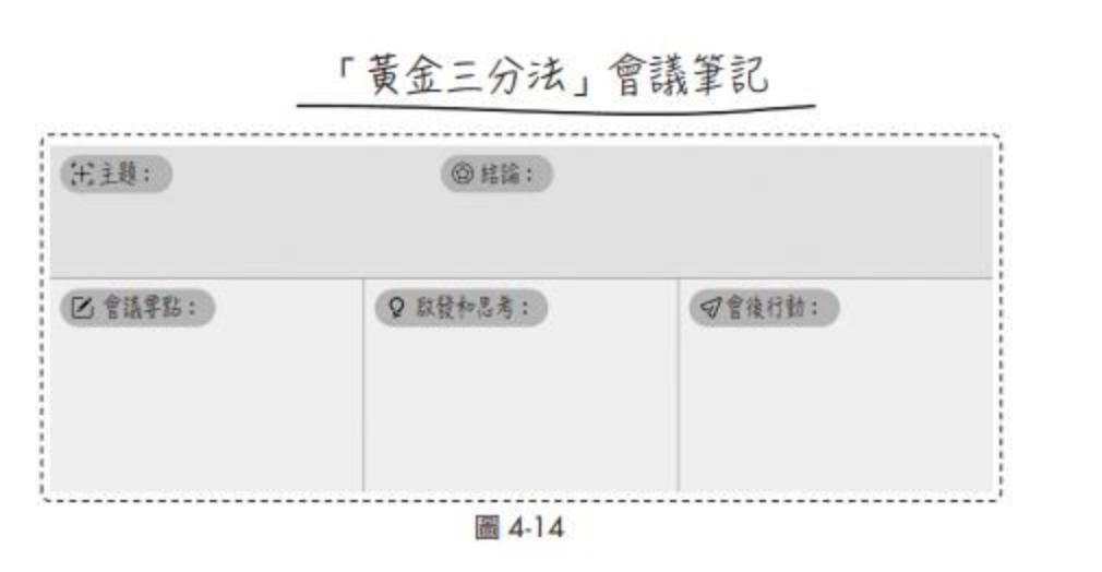 三者都有一個通用的框架—黃金三分法,即將筆記分割為三部分,以「要點→思考→行動」順序記筆記。個人使用的會議筆記可以沿用這個框架進行記錄(見下圖4-14)。