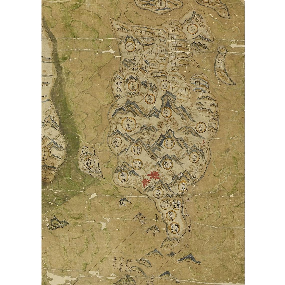泛黃的圖紙上畫有中國、臺灣、日本、朝鮮、菲律賓及東南亞島嶼,上頭以漢字標示地名與圖說,並繪有山脈、河流、各種植物,甚至還可見到萬里長城。地圖乍看有中國山水畫的影子,但其陸地形狀與比例大小卻類似現代地圖。