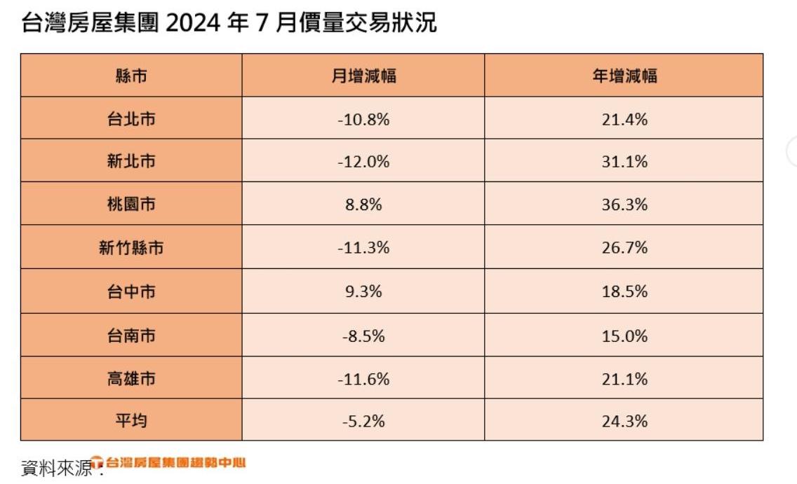 台灣房屋集團統計內部成交行情,觀察2024年7月價量變化,六都和新竹縣市交易量,唯獨桃園和台中交易量持續增溫,台中市仍較上月增加9.3%,桃園月增8.8%,其餘各都交易量收斂一成左右,七都整體交易量月減5.2%,但整體交易量仍較去年增24.3%。