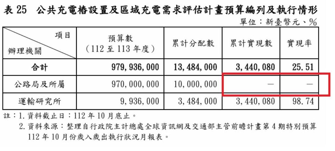 其中,「公共充電樁設置部分尚無實現數」,意思是預算撥下來都還沒有執行,進度是0。原因是,去年5月開始受理地方政府申請,去年10月才完成輔助計畫核定,審計報告中寫到「尚由地方政府草擬招標文件及辦理議會墊付案所致。」