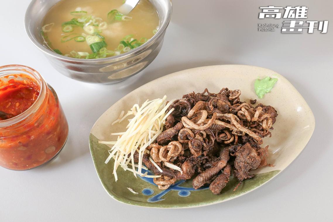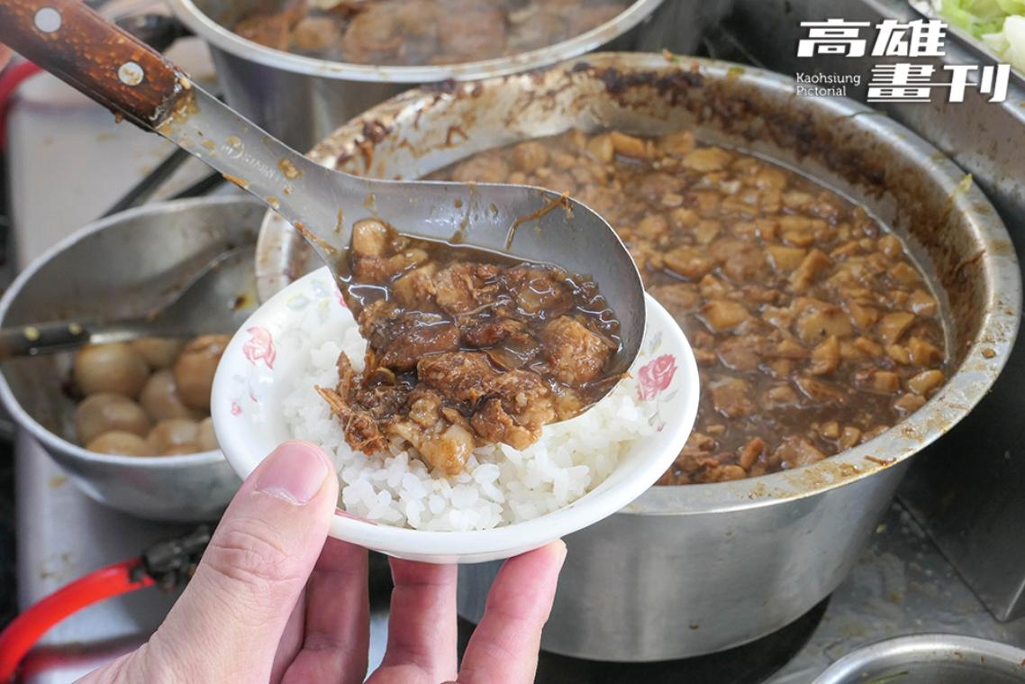 一大清早天還未亮,新興區中正市場旁的錦田肉燥飯就開始忙碌起來,大鍋內倒入滿滿溫體豬肉,400斤的豬肉先炒出血水,再以小火慢慢逼油炒上兩小時,最後加入蒜頭酥、古早味醬油等調味料入鍋慢滷,濃郁醇香的肉燥味頓時瀰漫整條巷子。