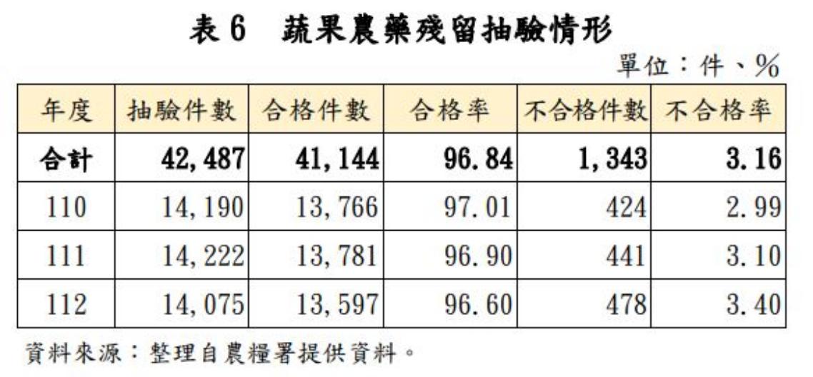 另外,在加強查驗面向,審計部指出,食藥署「農藥殘留容許量標準」久未重行檢視評估,仍有不符現行農藥使用規定或國際標準情事,且部分品項尚未開發檢驗方法,或僅列載未經查證或確效的建議方法清單,應通盤檢討研修農藥殘留容許量標準,並研謀加速檢驗方法的開發。