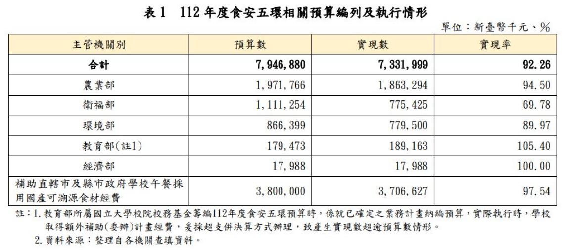 監察院審計部於7月29日公布112年中央政府總決算審核報告,其中關於「食安五環」的部分,審計部就源頭控管、重建生產管理、加強查驗、加重廠商責任及全民監督等四大面向,提出重要審核意見。