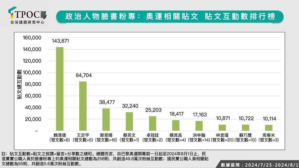 TPOC續指,巴黎奧運開幕前夕至8月1日止,民進黨黨公職人員於臉書粉專上的奧運相關貼文總數為258則、共創造49.8萬次粉絲互動數;國民黨公職人員相關貼文總數只有55則、共創造5.6萬次粉絲互動數,藍綠兩陣營「瘋奧運」的程度大相徑庭,而賴清德可說是這波「搶聲量大戰」當中的金牌得主。
