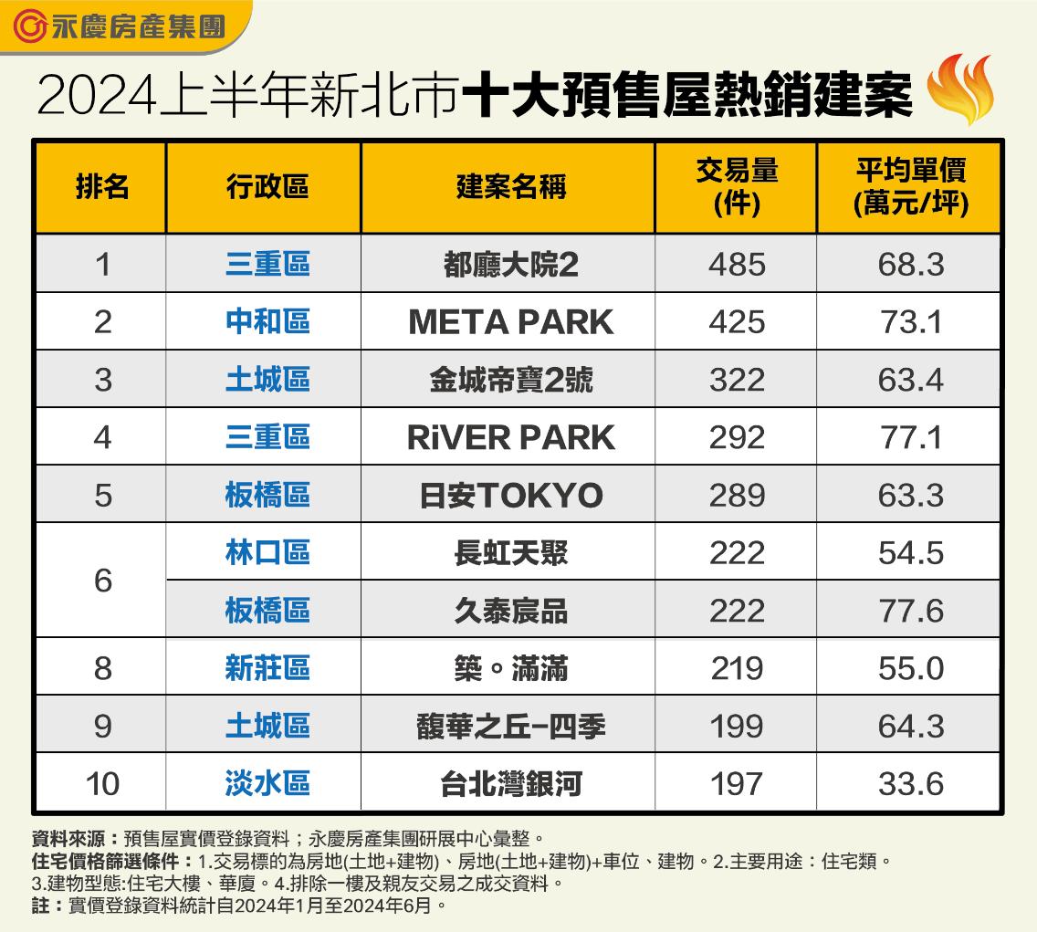 永慶房產集團根據實價登錄統計2024上半年新北市十大預售熱銷建案的交易價量。其中,三重區「都廳大院2」與中和區「META PARK」交易量均突破400件,分列一、二名,前十名榜單中,以淡水區「台北灣銀河」3字頭房價最親民。