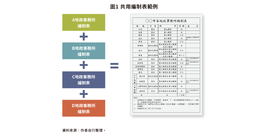 為了因應機關彈性用人需求,2022年5月修正任用法時,於第6條第3項新增但書規定,讓同層級類別相同的數個機關,得訂定共用編制表。例如,市政府訂定各地政事務所共用編制表後,可配合業務現況適時調整人力,員額移撥不必經過繁複的修編程序,有這條捷徑更能提高業務運作效能(如圖1)。
