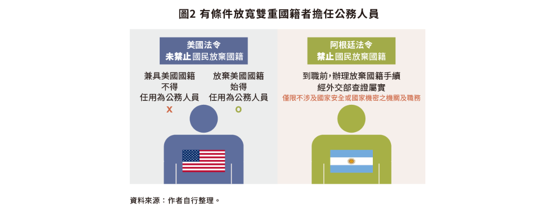 為了保障憲法賦予人民服公職權利,2022年修正的任用法第28條第2項提出解決方式,針對因外國法令不允許放棄國籍的特殊情形,只要在到職前按照國籍法第20條第4項辦理放棄外國國籍手續,經外交部查證無法放棄屬實,仍得擔任公務人員,但限於不涉及國家安全和國家機密的機關及職務。這條規定雖然可能適用的人員不多,但確實使憲法所保障的服公職權受到更完整的維護(如圖2)。