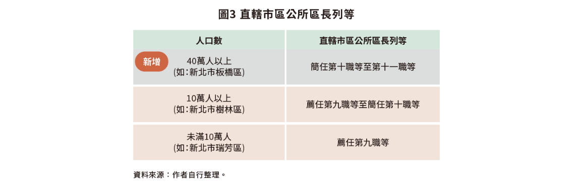 由於縣(市)改制(或合併)直轄市後,原來的鄉鎮市均改制為區,造成直轄市區公所的人口有明顯差異,特別是40萬人以上的區公所(如:板橋區),它們的業務量及職責程度與其他區相較,更為繁重。因此,銓敘部參考地方行政機關組織準則規定,提出以40萬人作為業務繁重程度的區分標準,新增1組直轄市區公所區長的官等職等為「簡任第十職等至第十一職等」,並經2020年12月3日考試院院會通過後實施(如圖3)。