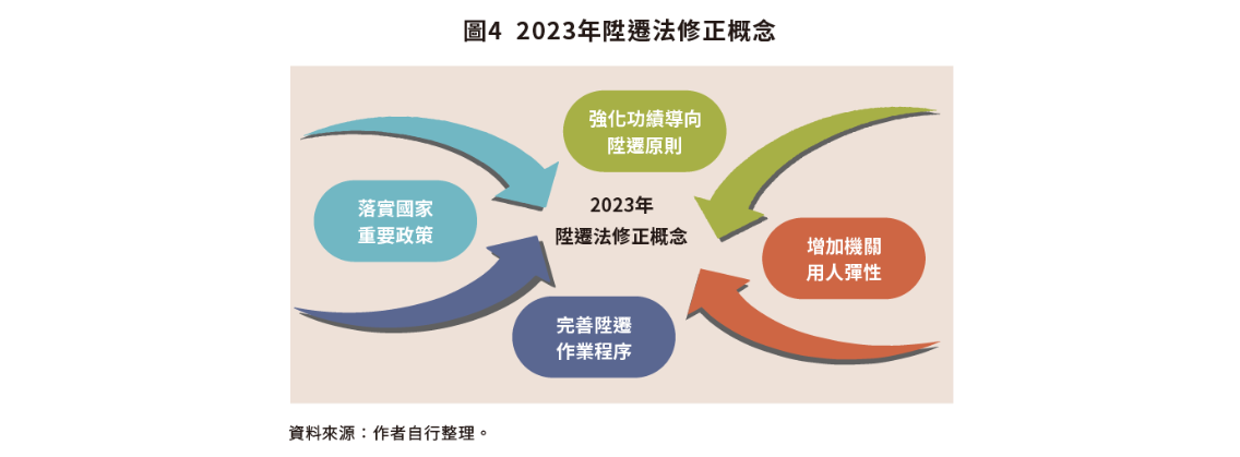 為了改善這個現象,2023年5月17日修正公布的陞遷法從強化「功績導向」的陞遷原則著手,降低考試、學歷及年資等因素對陞遷的影響,並為配合國家重要政策、增加機關用人彈性及完備作業程序,修正相關規定,讓優秀人才不會錯失陞遷之路,以達到拔擢和培育人才的最終目標(如圖4)。